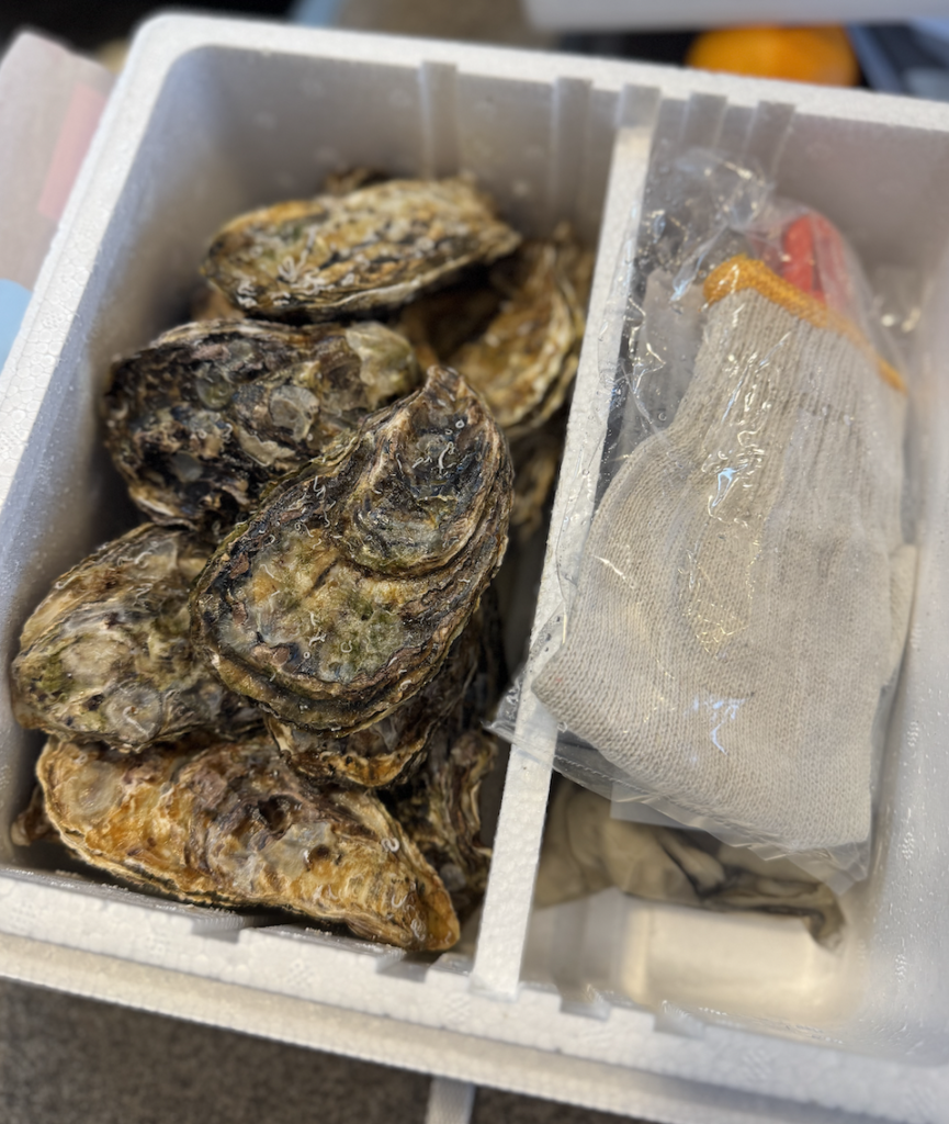 牡蠣の殻で手を切る可能性があるので、軍手をして作業をしてください。